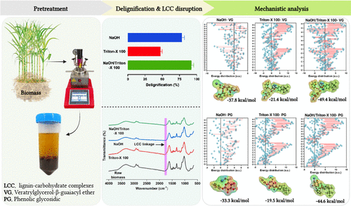 Abstract:Despite the notable efficacy of the NaOH-catalyzed Triton-X 100 system in fractionating lignocellulosic biomass (LCB), a significant gap remains in understanding the mechanistic pathways that drive this process. This study uses a dual-faceted approach, combining laboratory experiments with computational simulations to elucidate the mechanisms of delignification and lignin-carbohydrate complex (LCC) disruption. Under optimized conditions, both cellulose and hemicellulose recoveries reached around 88.5%, with delignification attaining an impressive 92.3%. Substantial changes in the physicochemical properties of the pretreated substrates were observed, including the removal of lignin and LCC-associated linkages, an enhanced crystallinity index (1.2–1.9 times), and an increase in surface area (1.2–1.4 times) compared to controls.This pretreatment system also facilitated frequent lignin depolymerization, leading to pronounced dissolution of syringyl and ferulate units. Furthermore, mechanical analyses demonstrated that this system promoted the highest interaction energy formations during LCB fractionation compared to individual NaOH or Triton-X 100 treatments alone.