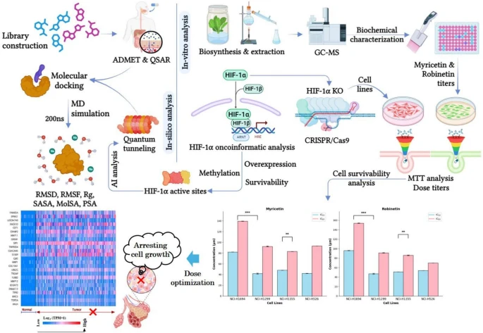 Abstract:HIF1α-driven lung adenocarcinoma, a fatal subtype of non-small cell lung cancer with 1.8 million deaths per year worldwide, highlights the need for new targeted treatments. The present work investigated the tumor-suppressing potential of the isolated and biochemically characterized flavonoids on HIF1α-driven lung adenocarcinoma through combined oncoinformatic profiling, molecular simulations, and CRISPR/Cas9-mediated HIF1α-knockout validation. Oncoinformatic profiling revealed HIF1α overexpression and promoter methylation as top predictors for poor prognosis. The pharmacokinetic and pharmacodynamic screening identified myricetin and robinetin as lead flavonoids with potent HIF1α binding by molecular docking (-9.33 to -8.98 kcal/mol) and long-term stability in long-duration molecular dynamics simulations (200 ns), supported by structural dynamics (RMSD, RMSF, Rg, SASA, MolSA, and PSA) and binding free energy (MM/GBSA) parameters. A twenty five-gene cluster linked HIF1α to flavonoid metabolism, suggesting synergistic therapeutic targets. CRISPR-engineered HIF1α-deficient NCI-H1694 (gene effect score-negative) cells were less flavonoid-sensitive (IC50/IC80 34.5/68.2 μM) than HIF1α-proficient gene effect score-positive cell lines (NCI-H1299, NCI-H526, NCI-H1355; IC50 12.4–18.7 μM), validating HIF1α-dependent activity. These results place myricetin and robinetin in the category of precision drugs for HIF1α vulnerability, with potential applications for flavonoid-based therapies in lung adenocarcinoma. Through a combination of computational design, biosynthesis, and functional validation, this research presents a paradigm for next-generation, HIF1α-targeted oncology therapies.